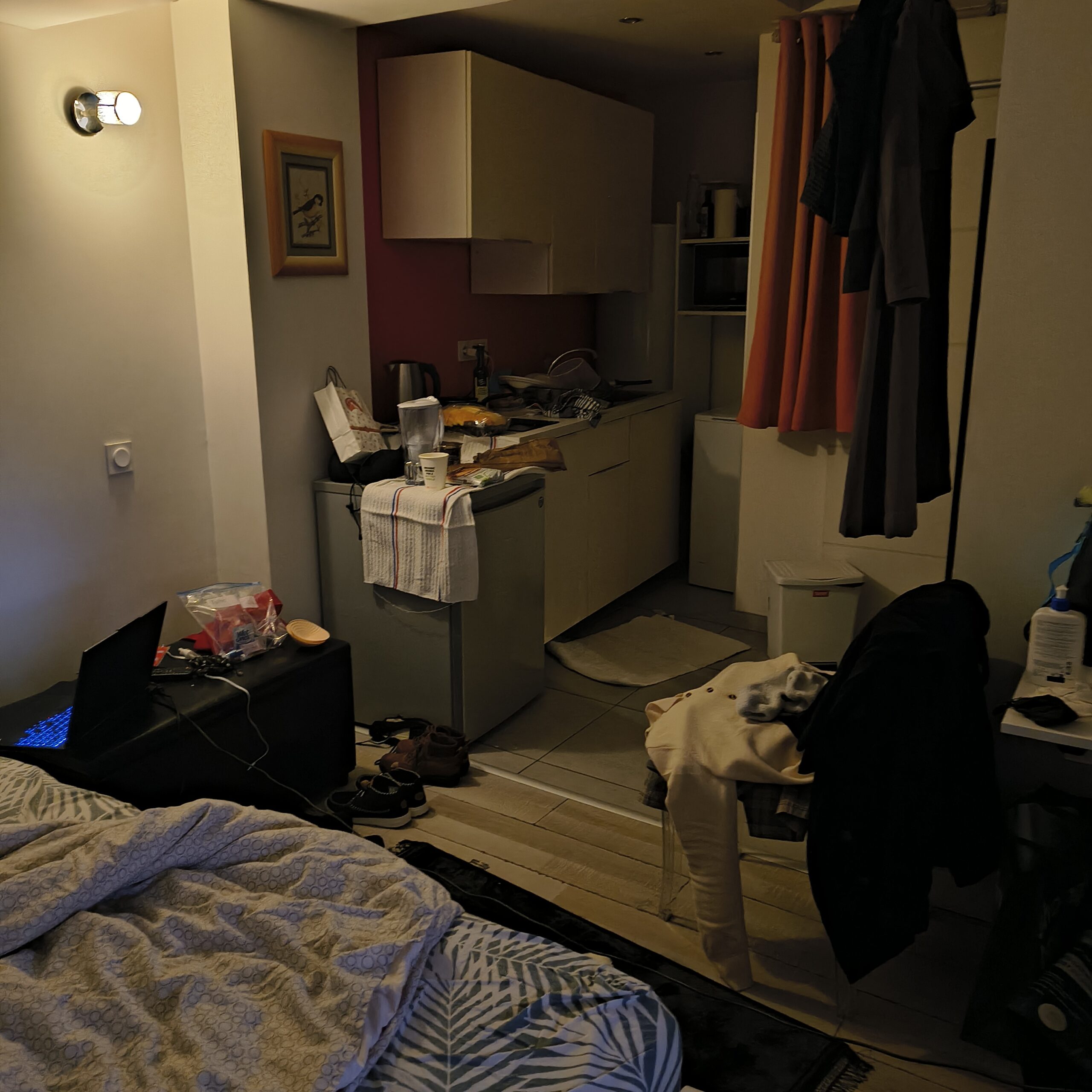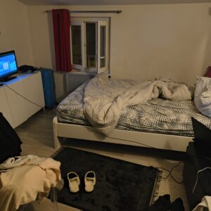 Then I opened the door to my apartment… and got another shock. The place looked nothing like the pictures. Maybe it was the jet lag making everything seem worse, but still. The bed wasn’t even made — the sheets were in a pile. The entire place was smaller than my bedroom back home.